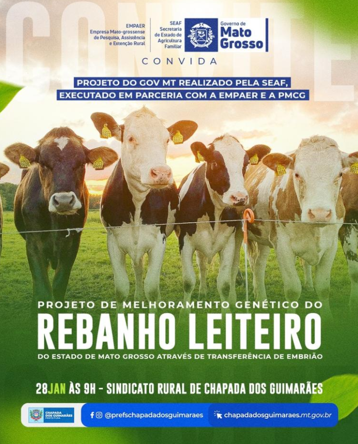 Chapada dos Guimarães recebe, nesta terça-feira (28), uma importante ação voltada ao fortalecimento da pecuária leiteira no município e em toda a região. A partir das 9h, no Sindicato Rural, a Prefeitura Municipal, em parceria com o Governo de Mato Grosso, realiza uma etapa presencial do Projeto de Melhoramento Genético do Rebanho Leiteiro, iniciativa estratégica para o desenvolvimento da agricultura familiar.